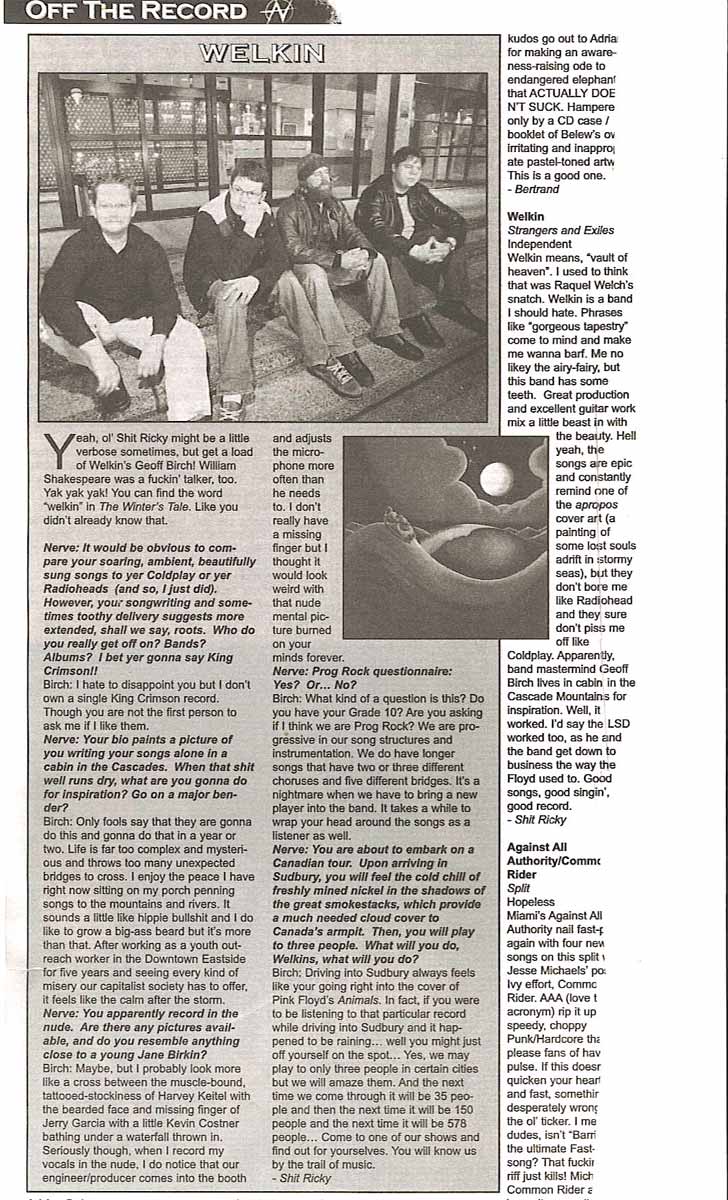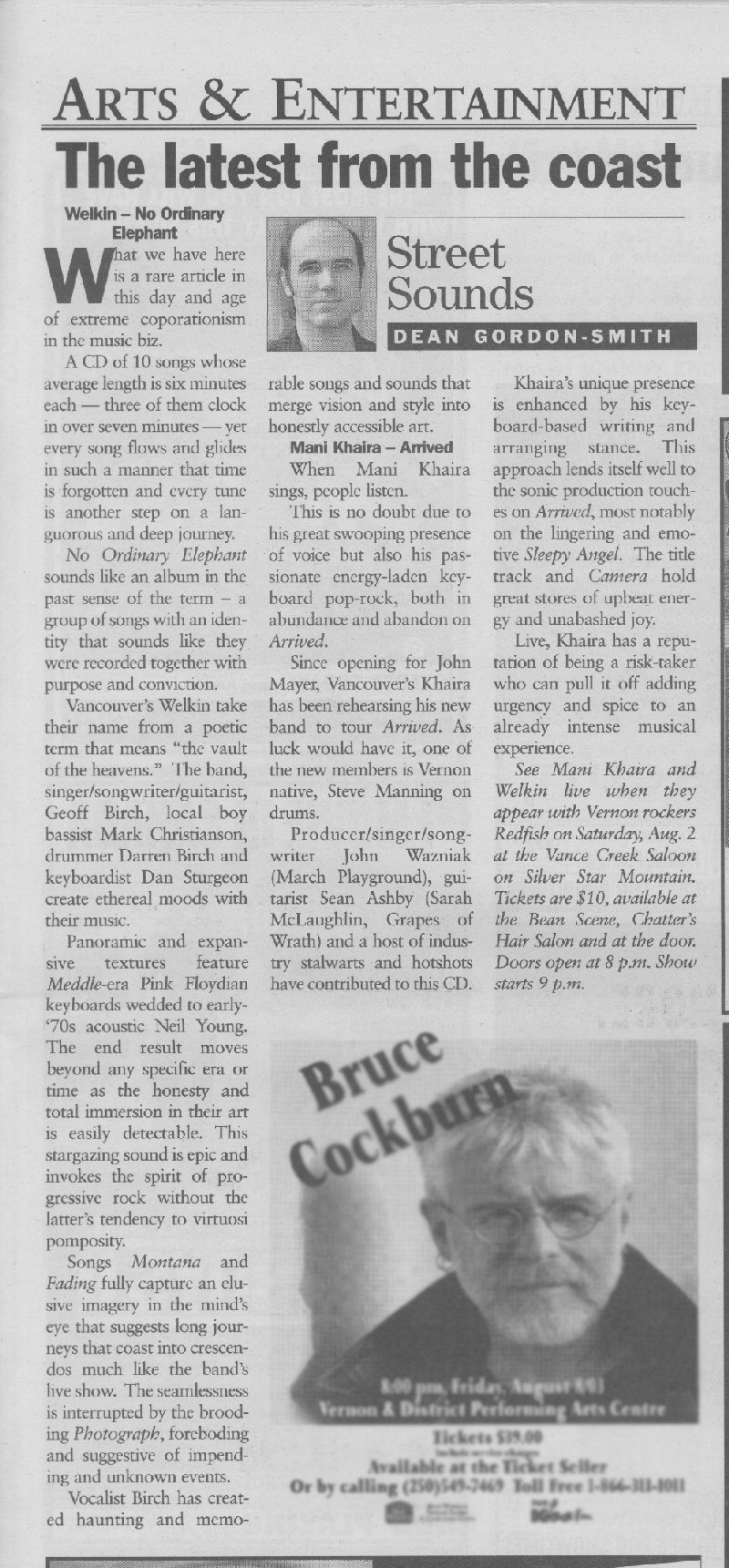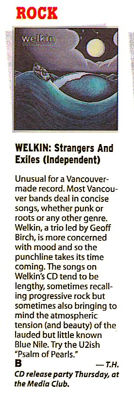 "Unusual for a Vancouver made record. Welkin, a trio led by Geoff Birch, is more concerned with mood so the punchline takes its time in coming. The songs on Welkin's CD tend to be lengthy, sometimes recalling progressive rock but sometimes bringing to mind the atmospheric tension (and beauty) of the lauded but little known Blue Nile."